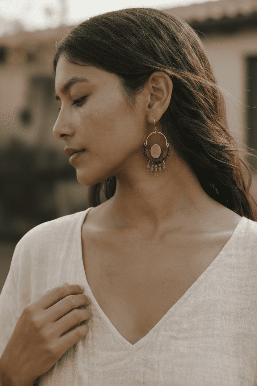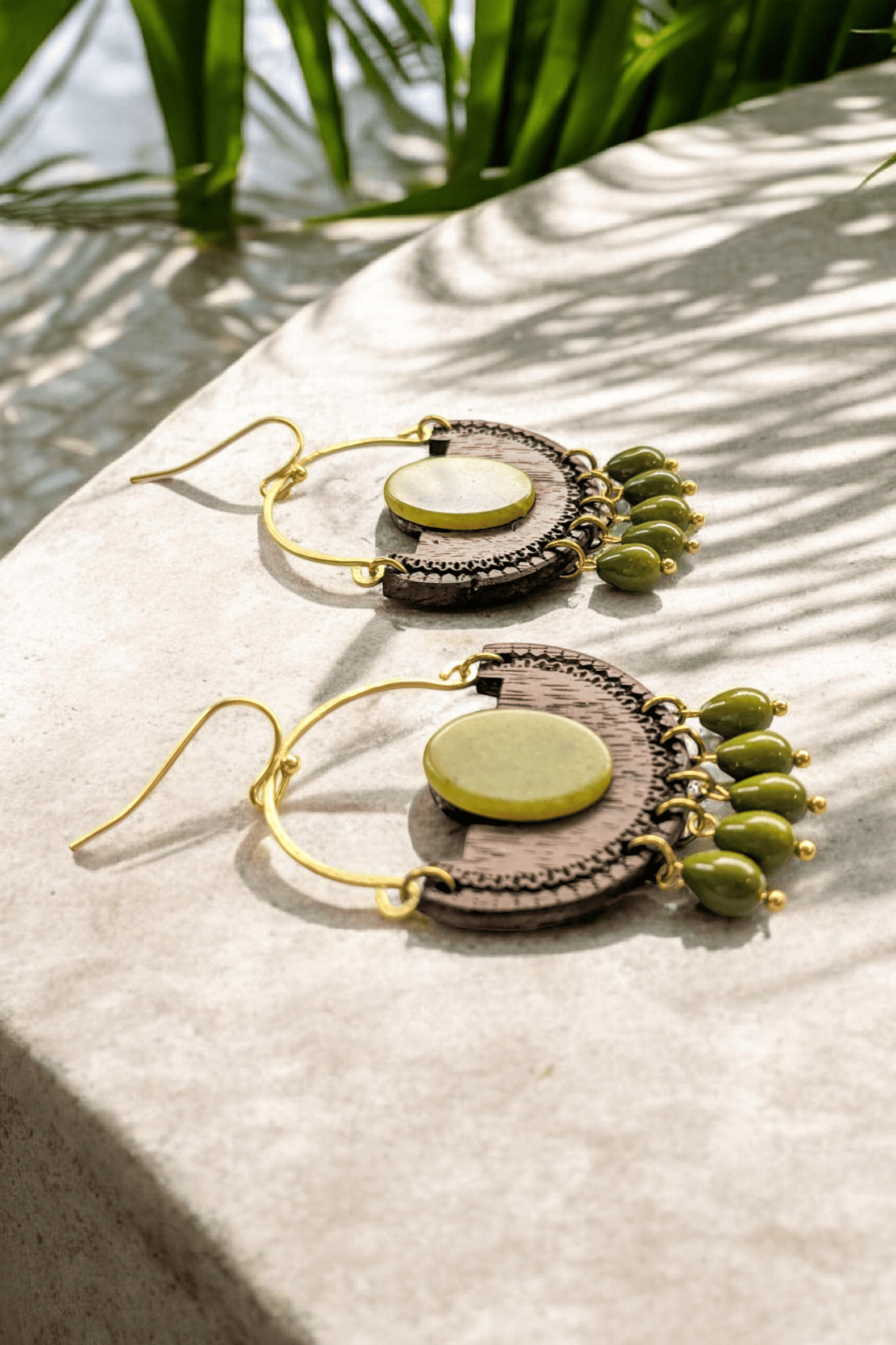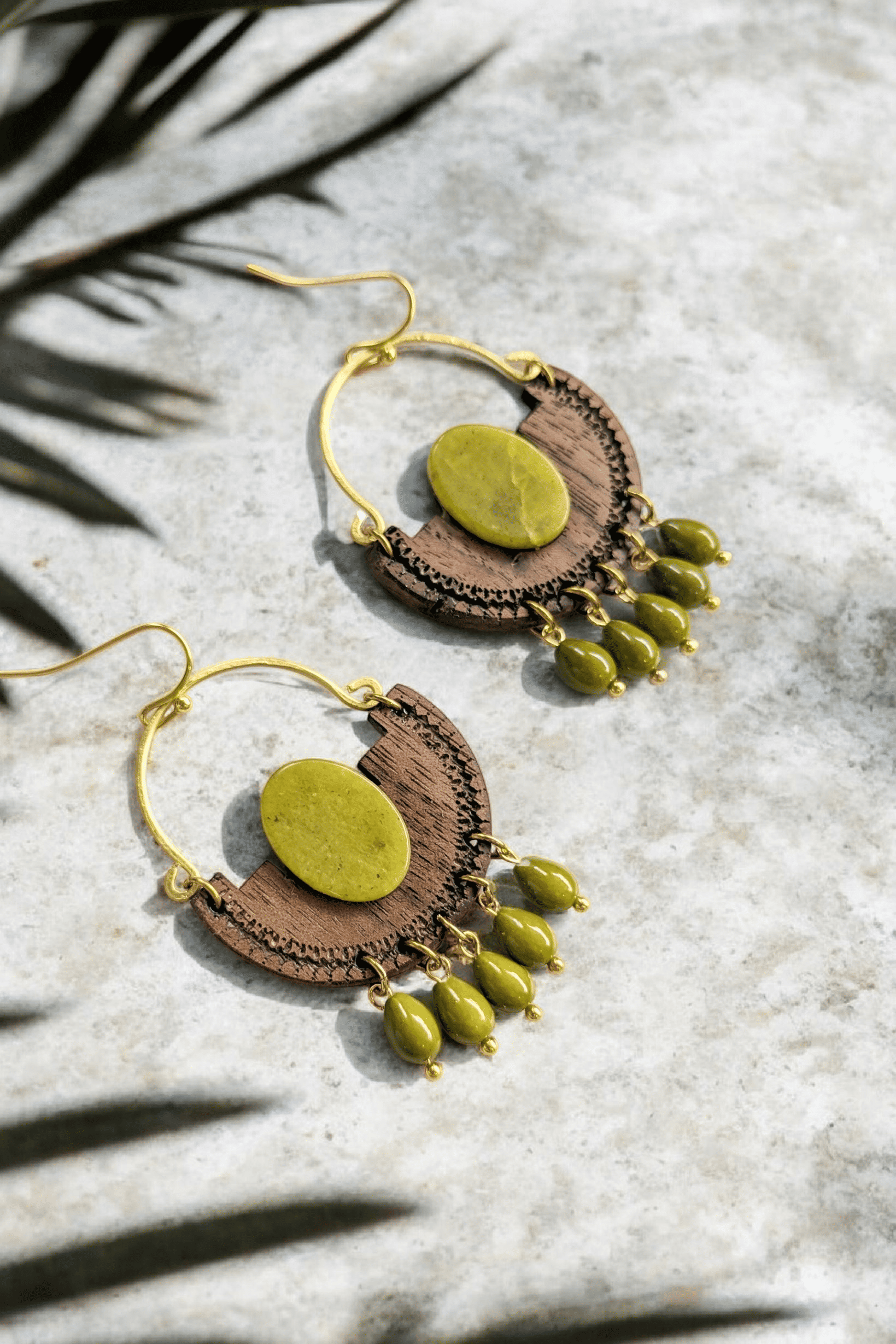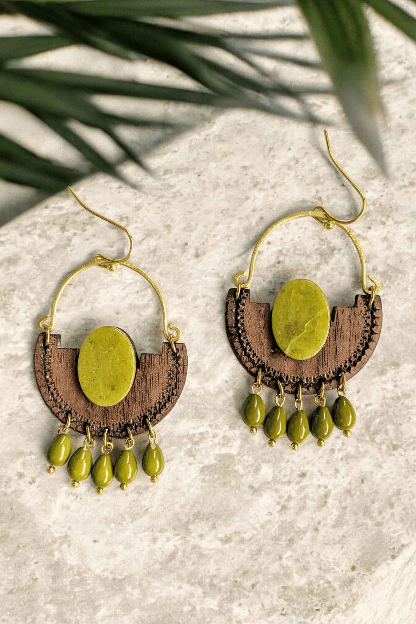 Boucles d’oreille en bois de noyer, laiton et jade vert