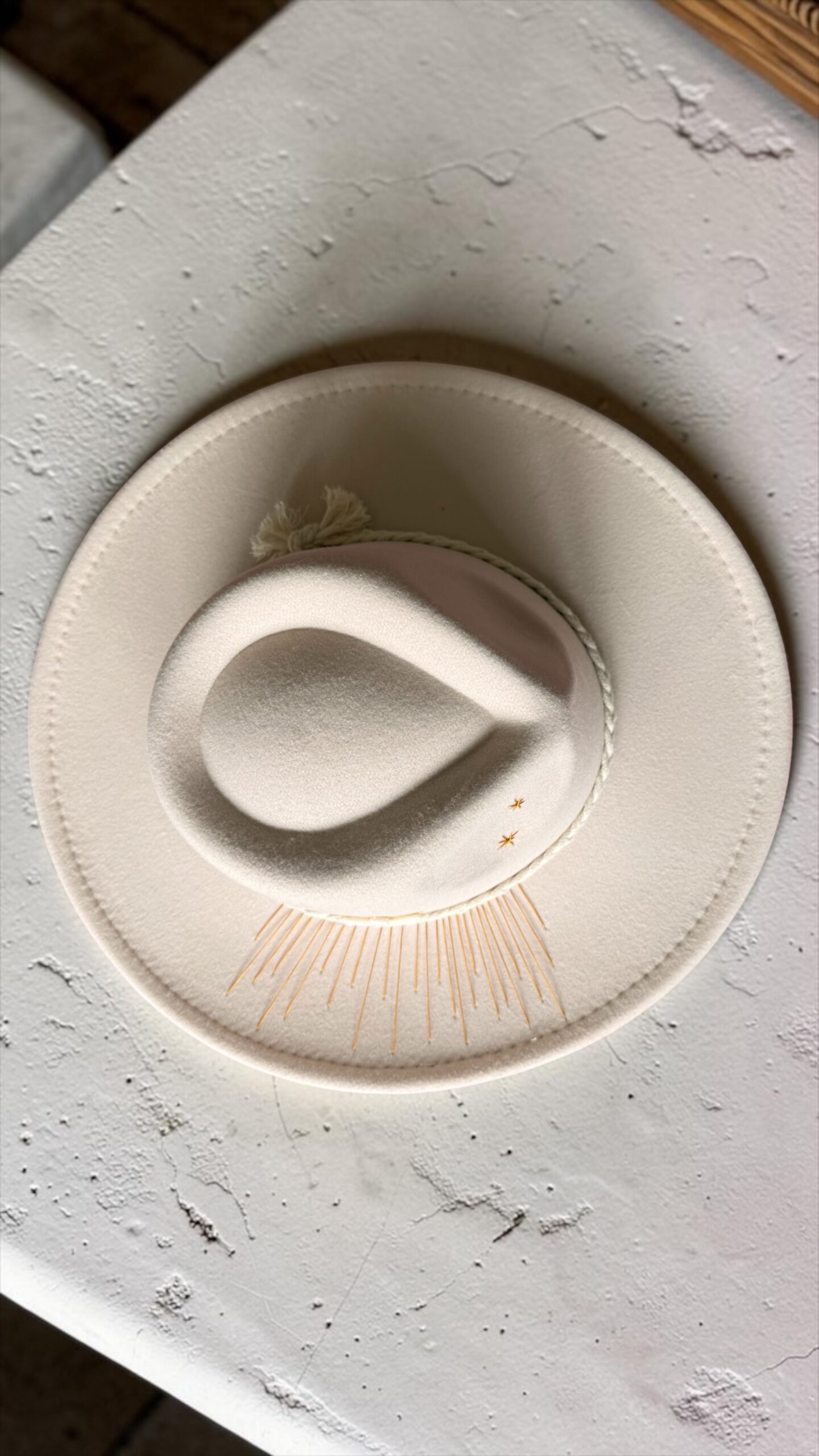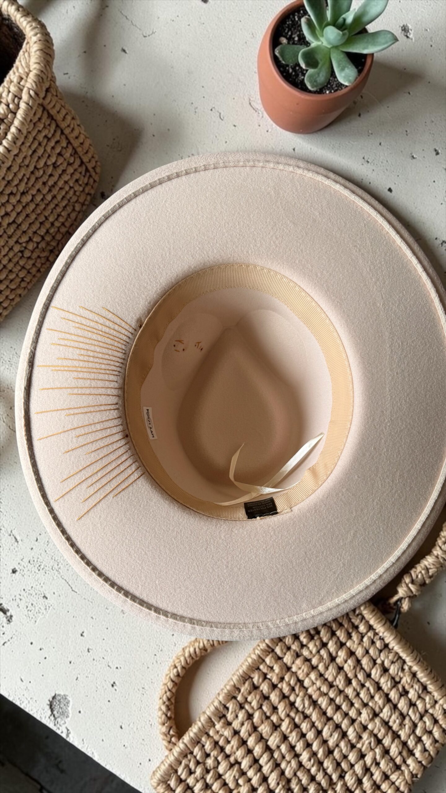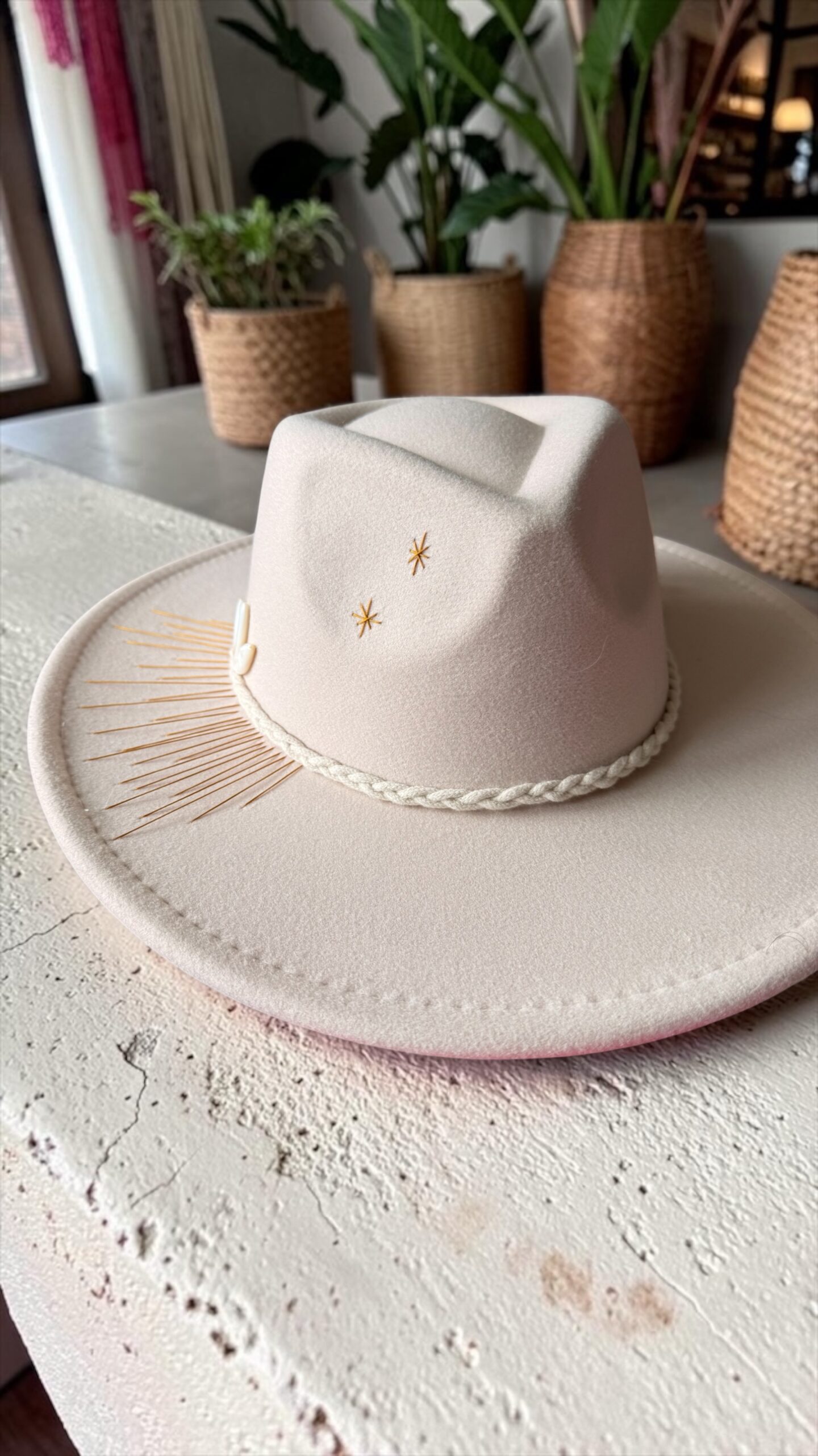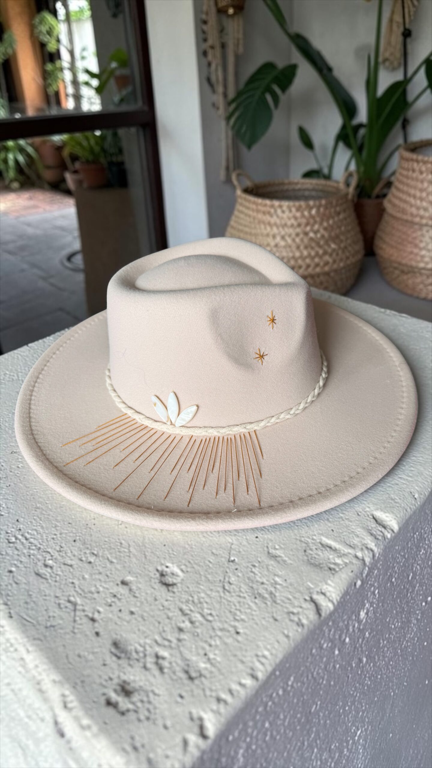 Ce chapeau étant délicatement customisé à la main, il est recommandé d’éviter tout contact avec l’eau.