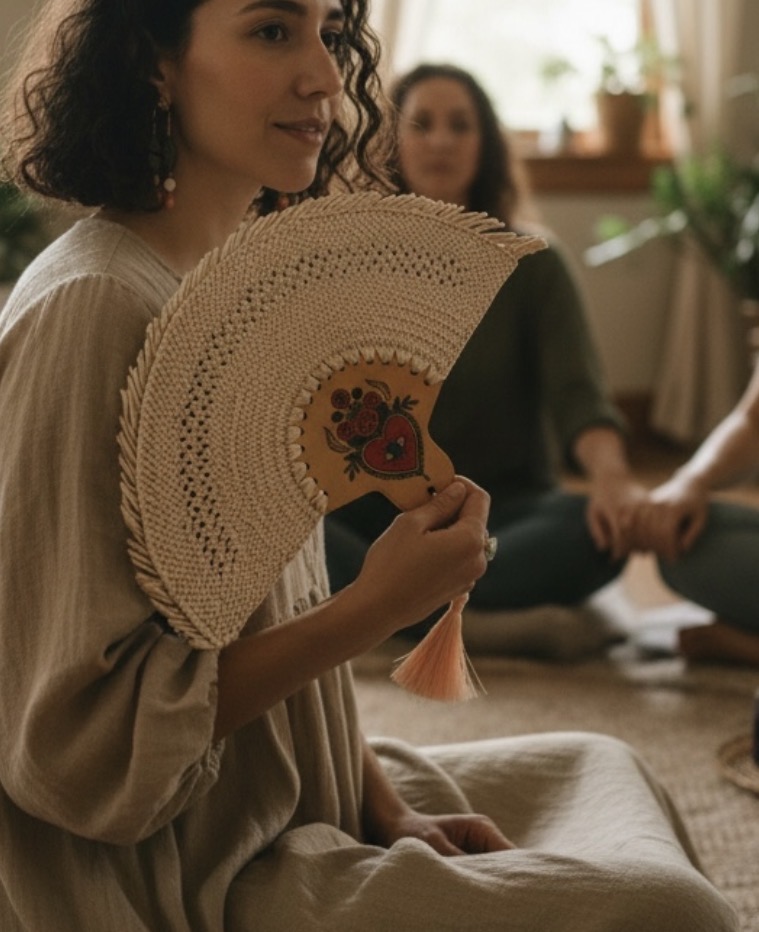 Éventail artisanal peint à la main, pensé comme un accessoire d’été aussi esthétique que fonctionnel.