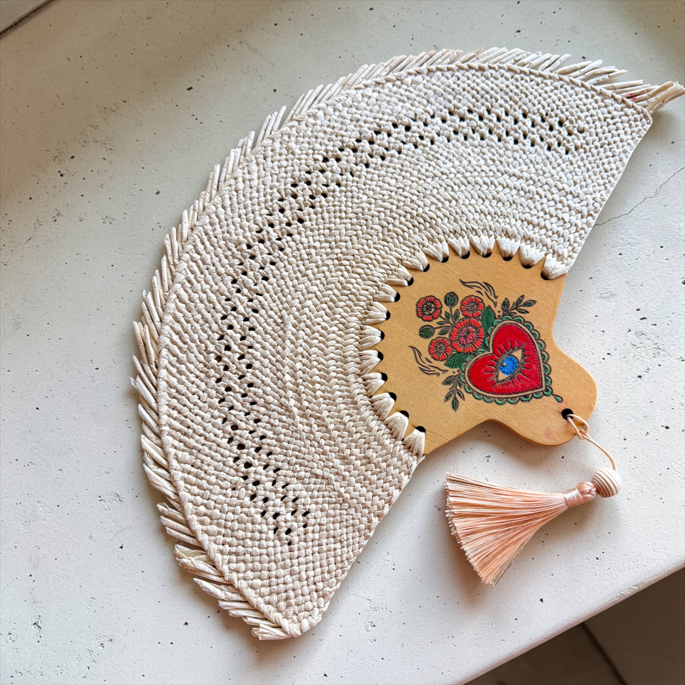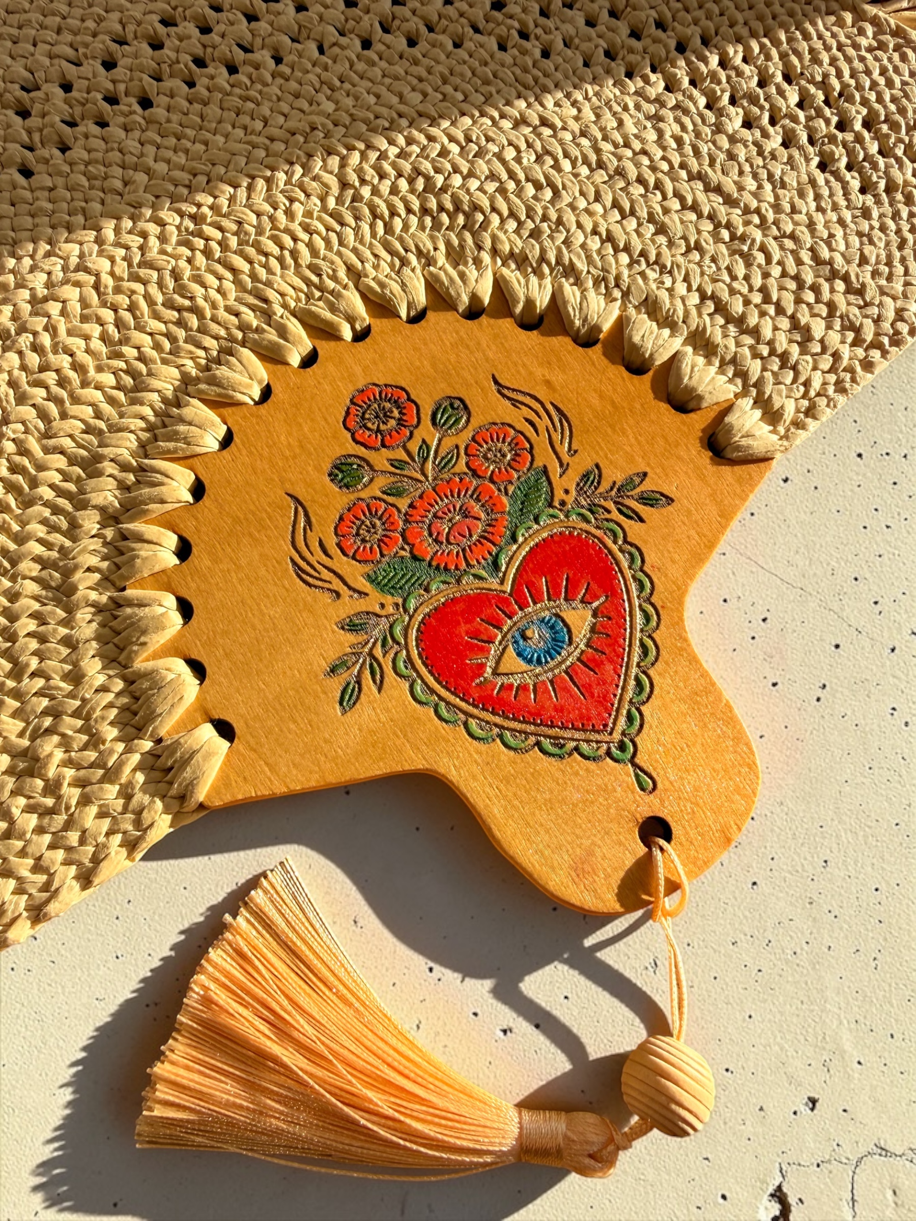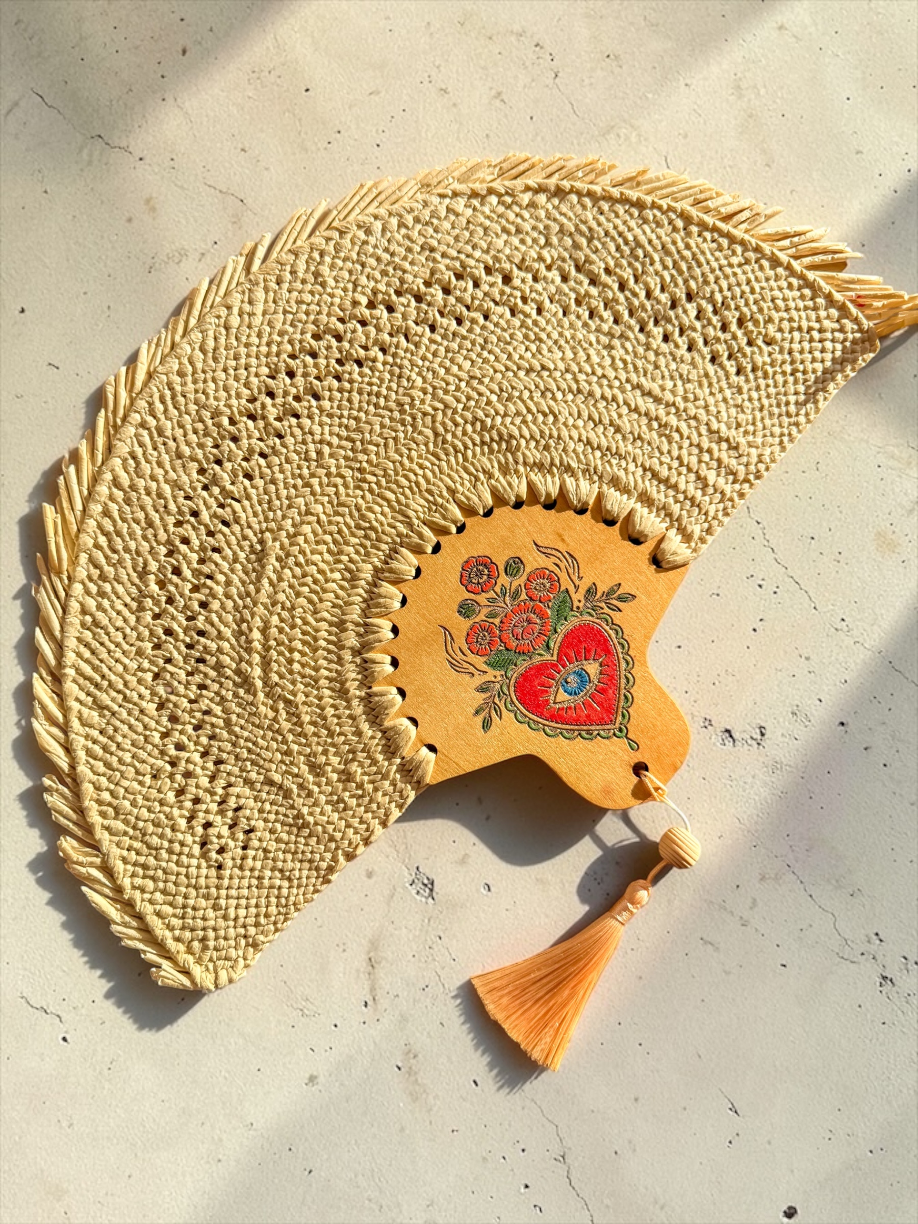 Un éventail unique, réalisé à partir de paille et de bambou, puis peint à la main.